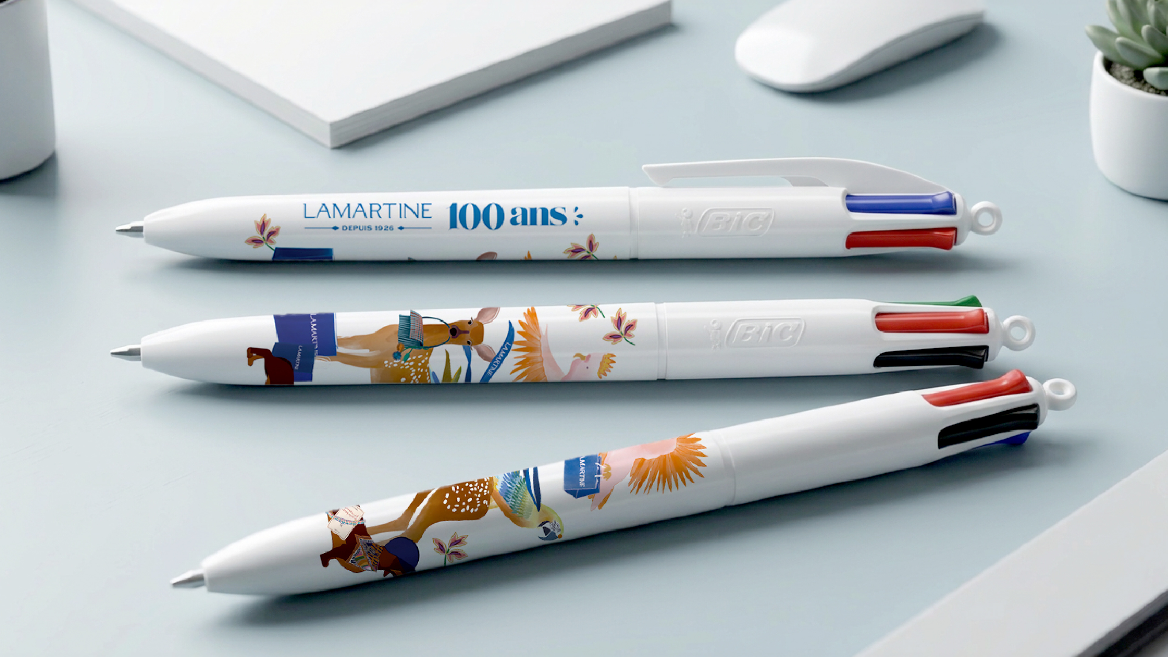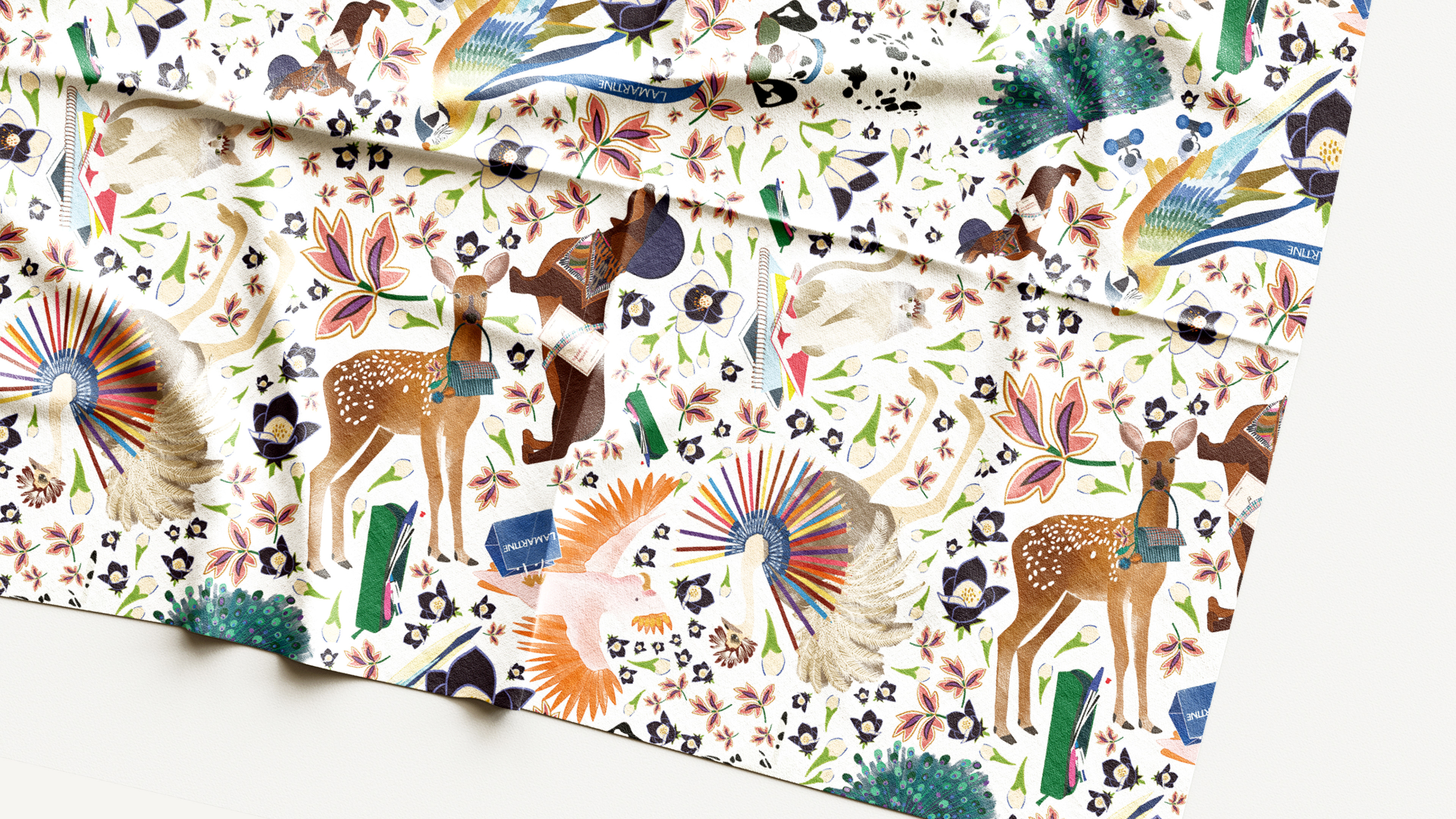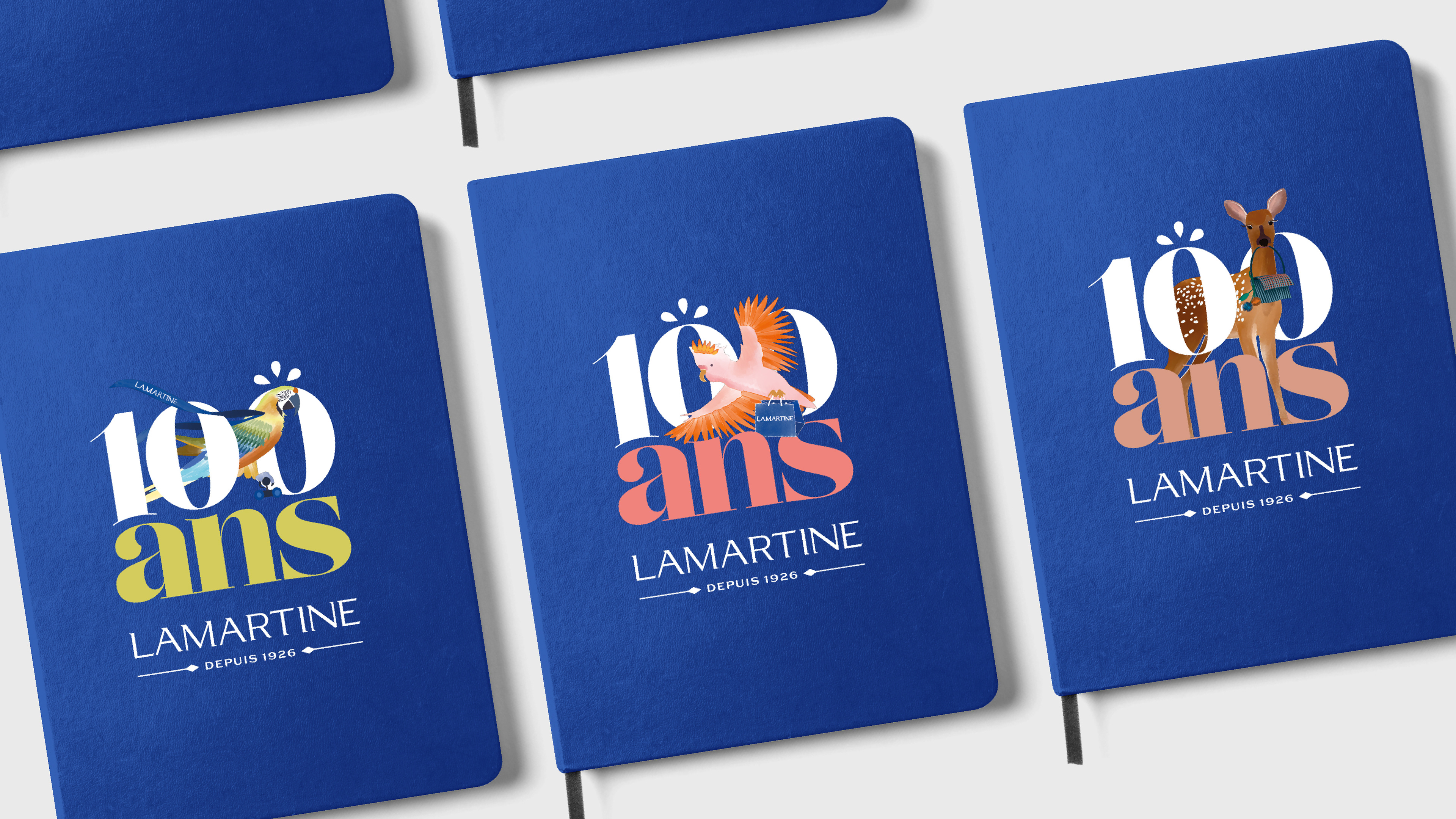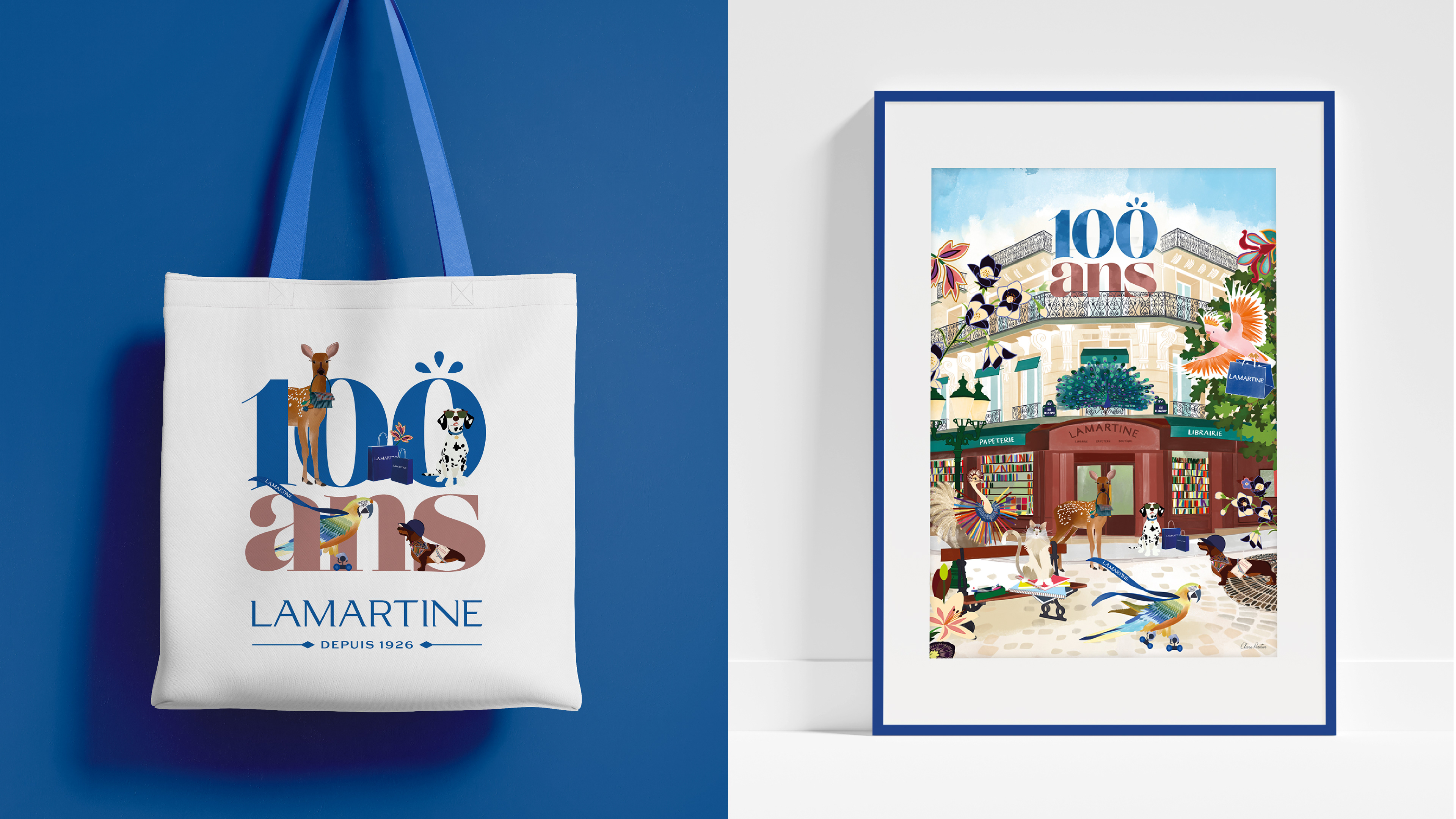 Pour les 100 ans de la librairie Lamartine, création d'un univers graphique décliné sur une collection de produits divers : affiches, cartes postales, bic 4 couleurs, tote bag, pochettes tissu, puzzle... Illustration signée Clara Panetier.